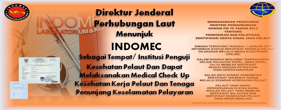 Indomec merupakan salah satu Klinik yang ditunjuk oleh Direktur Jendral Perhubungan Laut yang dapat menguji kesehatan pelaut / Sertifikat Kesehatan Pelaut /